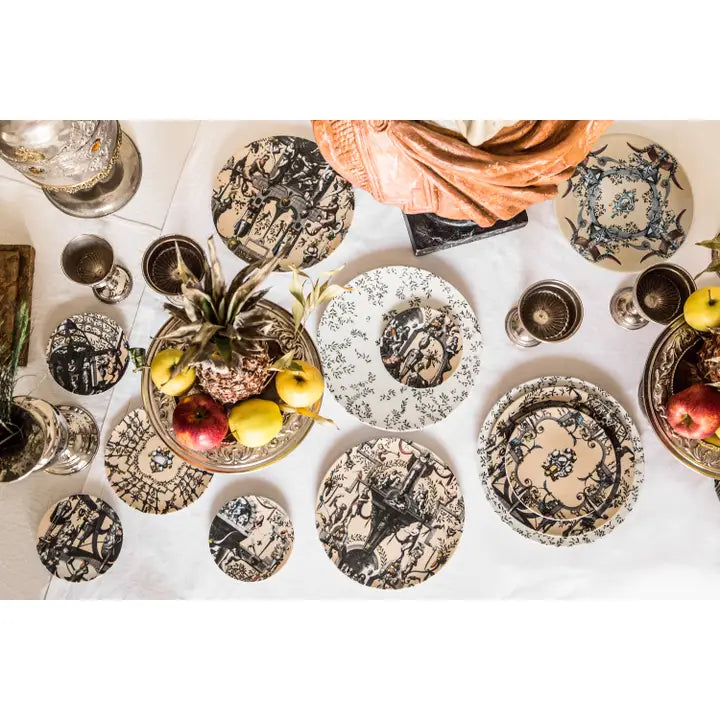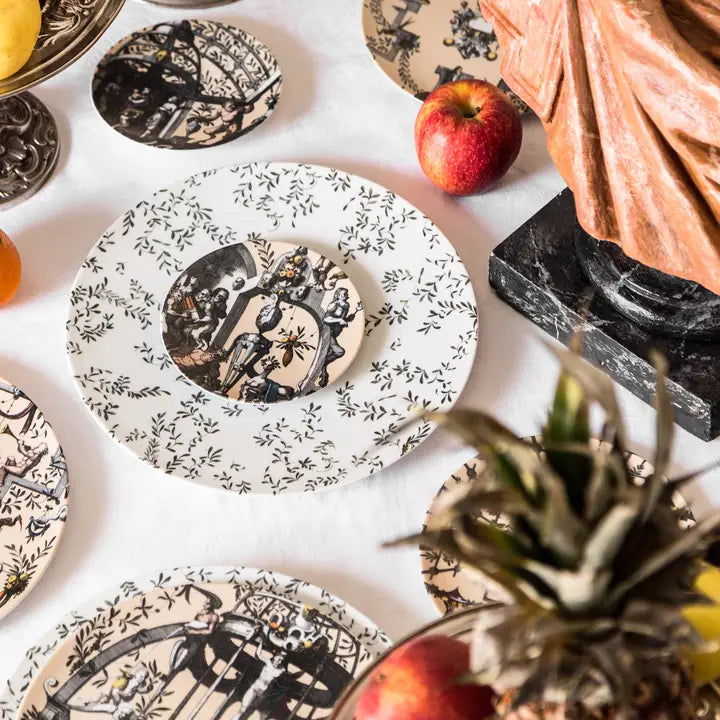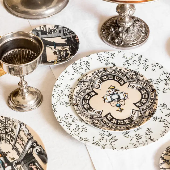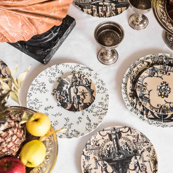 The Pompei collection by Grand Tour By Vito Nesta revives the grotesque wall decorations in a contemporary key. Antique drawings are taken up and declined on the different formats of the mise en place in order to create elegant and unique overlays. Natural elements, anthropomorphic figures, jewels and architecture come together to create stories, decorations and geometries that fill the eye and intrigue the mind. This collection manages to be transversal, adapting both to regal and elegant tables and to more formal environments, elevating them with flair.