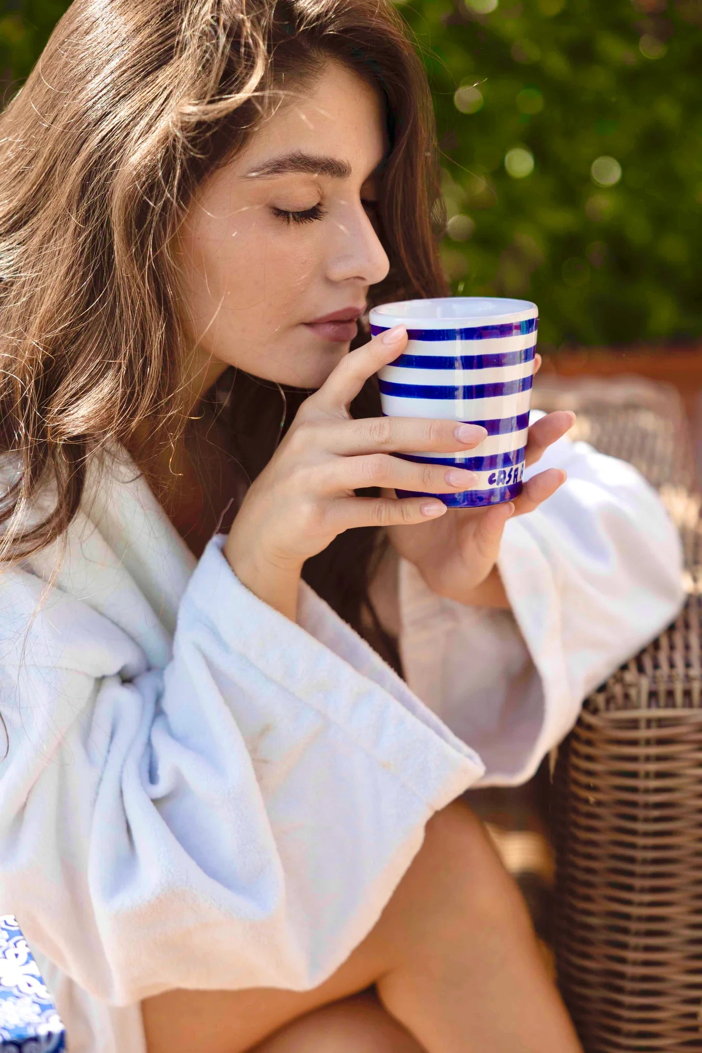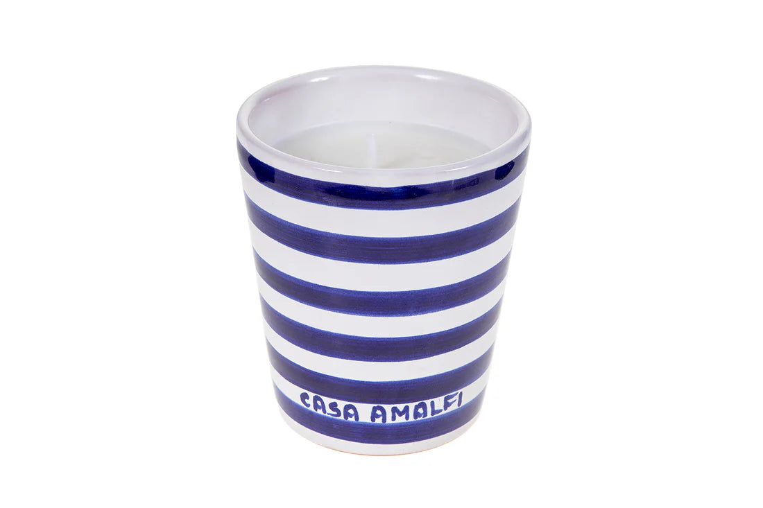 Escape to the Mediterranean with our Blue Grotto candle. Encased in a hand-painted ceramic cup featuring nautical stripes, it evokes the serene beauty of the coast. Let refreshing marine scents, blended with woody notes and zesty citrus, whisk you away to sun-dappled shores and crystal-clear waters. A simple, yet romantic escape that turns any room into a coastal retreat.